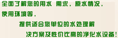 主營(yíng)產(chǎn)品: · 反滲透純凈水設(shè)備(去離子水) · 超濾過濾系統(tǒng)(桶裝水) · 軟化水設(shè)備 · 超純水設(shè)備 · 一體化/污水處理設(shè)備 · 水處理設(shè)備配件及耗材 |